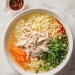 Aromatic Ginger Scallion Chicken Noodle Soup is a flavorful and comforting dish featuring tender chicken simmered with ginger, garlic, and scallions in a light broth, served with chewy ramen noodles and crisp carrot matchsticks. The soup is elevated with a tangy soy-vinegar sesame drizzle and a touch of crispy chili oil, making it a perfect meal for any day craving warmth and umami-rich flavors.