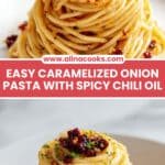 A flavorful and comforting Caramelized Onion Pasta with a spicy chili oil drizzle, combining sweet, rich onions with a kick of heat. This simple yet elegant dish is perfect for a cozy meal and can be customized with your favorite pasta shape and garnish options.