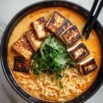 This Creamy Coconut Curry Ramen with Tofu is a flavorful and comforting vegan dish that combines rich coconut milk, fragrant red curry paste, and fresh vegetables for a wholesome meal. Tender ramen noodles swim in a spiced coconut broth, topped with golden sautéed tofu, spinach, mushrooms, and vibrant garnishes, delivering a perfect balance of creamy, savory, and tangy flavors in every bowl.