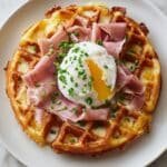 Place your freshly made waffles on a baking sheet lined with parchment or a silicone mat. Spoon the béchamel sauce generously over each waffle – about a sixth of the sauce per waffle does the trick. Layer with slices of shaved ham and a sprinkle of Gruyere cheese for that lovely melt on top. Pop these under your broiler just until the cheese bubbles and the béchamel is warmed through – keep a close eye as this happens quickly! Finally, top each waffle with a perfectly cooked egg (fried or poached, just the way you like it) and finish with a sprinkle of chopped chives if you want an easy fresh touch. Now, dive in and savor the creamy, crispy goodness together.