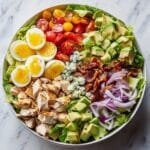 A fresh and vibrant Spring Cobb Salad featuring crisp mixed greens, juicy cherry tomatoes, cucumbers, tender cooked chicken breast, crispy bacon, creamy avocado, tangy blue cheese, and hard-boiled eggs, all drizzled with a flavorful balsamic vinaigrette. This salad offers a perfect balance of textures and flavors, making it an ideal light lunch or a refreshing dinner option.