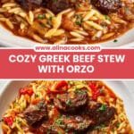 Greek Manestra is a comforting and hearty stew featuring tender beef cubes, orzo pasta, and a rich tomato-based sauce seasoned with aromatic cinnamon and bay leaf. This traditional Greek dish is perfect for a cozy meal, combining the warmth of slow-simmered beef with the delicate texture of orzo, garnished with fresh parsley for a burst of flavor.