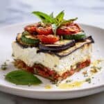 This Layered Mediterranean Vegetable Lasagna with Creamy Ricotta is a delightful and hearty vegetarian dish featuring roasted eggplant, zucchini, and bell peppers layered with noodles, marinara sauce, and a flavorful ricotta mixture. Topped with mozzarella and parmesan cheese, it’s baked to golden perfection and garnished with fresh basil leaves, making it a perfect comforting meal packed with Mediterranean flavors.