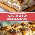 These Ham & Cheese Sliders are a delicious and easy-to-make appetizer or snack featuring tender cooked ham and Swiss cheese sandwiched between soft Hawaiian rolls, then baked with a flavorful butter, mustard, onion, and poppy seed glaze for a crispy, golden topping.