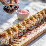 Slice and Serve: Using a sharp knife dipped in water, slice the roll into 8 equal pieces to prevent sticking. Arrange on a plate, drizzle with additional sauce if desired, and serve alongside soy sauce, pickled ginger, and wasabi for an authentic sushi experience.
