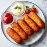 Classic American corn dogs featuring juicy hot dogs dipped in a crispy, golden cornmeal batter and fried to perfection. Served on a stick, these crunchy, savory treats are perfect for a fun snack or casual meal.