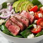 This Keto Beef and Spinach Salad is a delicious and nutritious low-carb meal featuring tender grilled flank steak served over fresh spinach, cherry tomatoes, and avocado, all tossed in a tangy balsamic vinaigrette. Perfect for those following a ketogenic diet, this salad balances rich protein with fresh vegetables and healthy fats for a satisfying and wholesome dish.