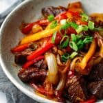 This Keto Beef Pepper Steak is a quick and flavorful low-carb dinner option featuring tender sirloin steak, colorful bell peppers, and onions all cooked in a savory soy-ginger sauce. Perfect for keto and gluten-free diets, this stir-fry style dish comes together in under 30 minutes and is garnished with fresh green onions for an extra burst of flavor.