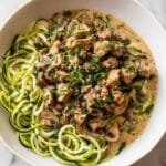 Keep it simple but elegant: place your zucchini noodles or cauliflower rice neatly on the plate, spoon over the stroganoff so it pools just right, then scatter chopped parsley on top. A few crispy mushroom slices on the side or a tiny drizzle of olive oil can add a restaurant-style touch without extra effort.