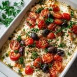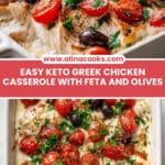 This Keto Greek Chicken Casserole is a creamy, flavorful dish combining tender cooked chicken, juicy cherry tomatoes, salty olives, and tangy feta cheese, all baked together with herbs and garlic for a rich, satisfying low-carb meal perfect for dinner.
