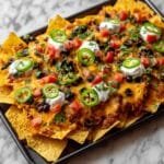 Loaded Nachos are a delicious and colorful appetizer or snack featuring crispy tortilla chips topped with melted cheddar and Monterey Jack cheeses, black beans, fresh jalapeños, tomatoes, black olives, sour cream, and cilantro. Baked to perfection, these nachos are perfect for sharing at parties or enjoying as a tasty treat with salsa on the side.