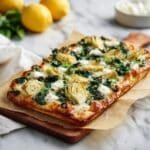 This Spinach-Artichoke Flatbread is a quick and delicious appetizer or snack featuring a creamy blend of spinach, artichokes, and cheeses spread over crispy flatbread or pizza dough. Perfectly baked to golden edges and bubbly cheese, it's a flavorful way to enjoy a classic dip in flatbread form.