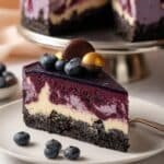 This Midnight Cheesecake features a creamy, smooth cream cheese filling swirled with a fragrant blueberry lavender compote atop a buttery graham cracker crust. Baked to perfection, this elegant dessert combines the classic richness of cheesecake with a floral and fruity twist, making it a visually stunning and delicious treat perfect for any special occasion or cozy night in.