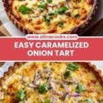 This classic Onion Tart features a buttery shortcrust pastry filled with sweet, caramelized onions and a rich custard of eggs, cream, and melted cheese. Perfect as a savory appetizer or light meal, it balances creamy texture with the deep flavor of slowly sautéed onions and a hint of nutmeg for extra warmth.