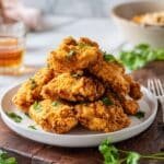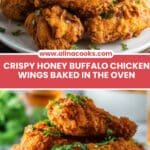 Crispy baked buffalo chicken coated in a crunchy cornflake and parmesan crust, drizzled with a sweet and spicy homemade honey buffalo sauce, topped with fresh green onions and blue cheese or ranch dressing for a flavorful and satisfying meal.