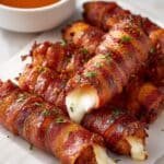 These Nashville Hot Bacon Wrapped Mozzarella Sticks are a spicy, crispy appetizer combining gooey melted mozzarella cheese wrapped in smoky bacon and coated with a flavorful Nashville hot sauce blend. Perfect for game day or parties, they deliver a satisfying kick with every bite.