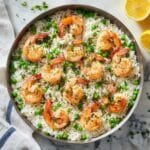 A flavorful and easy one-pot meal featuring garlic butter shrimp cooked with tender rice and sweet peas, perfect for a quick weeknight dinner.