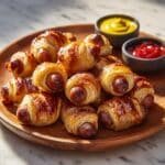 Pigs in a Blanket are a delightful appetizer featuring mini hot dogs wrapped in flaky crescent roll dough and baked to golden perfection. This simple, crowd-pleasing recipe is perfect for parties, snacks, or game day treats, served warm with your favorite dipping sauces such as mustard or ketchup.