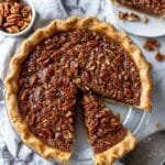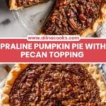 A delectable Praline Pumpkin Pie featuring a crunchy pecan praline base, smooth spiced pumpkin filling, and a buttery praline topping, perfect for fall celebrations and holiday desserts.