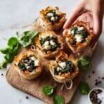 These Pumpkin Feta Phyllo Cups are a delightful appetizer combining tender sautéed pumpkin, creamy feta cheese, and fresh baby spinach wrapped in crispy, buttery phyllo dough. Perfectly seasoned with a hint of honey and garnished with seeds, these savory cups offer a balanced mix of flavors and textures, ideal for entertaining or a festive snack.