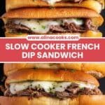 This Slow Cooker French Dip Sandwich recipe features tender, slow-cooked chuck roast simmered in a savory broth with red wine, onions, and garlic, served on garlic butter toasted rolls with provolone cheese and fresh parsley. Perfect for an easy and comforting meal, the beef melts in your mouth and the au jus dipping sauce adds a rich, flavorful finish.