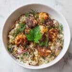 This Smashed Potato Salad features tender baby potatoes lightly smashed and baked to crispy perfection, then mixed with a creamy Greek yogurt dressing infused with Dijon mustard, fresh herbs, and a hint of lemon. A delicious twist on classic potato salad that's perfect served warm or at room temperature.
