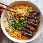 This Spicy Korean Ramen with Grilled Beef & Creamy Sauce Recipe is a delicious balance of bold, spicy heat tempered by a silky, cooling sauce and juicy, caramelized beef. The playful contrast keeps each bite exciting!