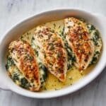 Delicious and savory Spinach and Feta Stuffed Chicken Breast, combining tender chicken breasts filled with a flavorful blend of fresh spinach, creamy feta, and cream cheese, perfectly seasoned with garlic, oregano, and lemon juice, then seared and baked to juicy perfection.