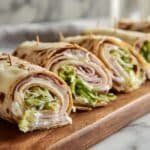 These Sun-Dried Tomato & Turkey Pinwheel Sandwiches are a delicious, easy-to-make finger food perfect for gatherings or a light lunch. Featuring a creamy spread of sun-dried tomatoes and cream cheese, layered with sliced turkey, cheese, and fresh lettuce, all rolled into soft tortilla wraps and sliced into bite-sized pinwheels.