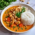 - Serve and garnish: Serve the warm Thai peanut curry over cooked jasmine, white, or brown rice. Garnish with chopped peanuts for added texture and flavor.