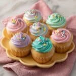 These classic vanilla cupcakes are light, fluffy, and perfect for any occasion. Topped with colorful, creamy buttercream icing and sprinkles, they offer a delightful balance of simple flavors and fun decorations that kids and adults will love.