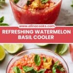 This Watermelon Basil Cooler Recipe is a winning combo of juicy watermelon’s natural sweetness with the subtle pepperiness of fresh basil, all brightened up with zesty lime and topped off with bubbly sparkling water. The drink stays light and downright addictive.